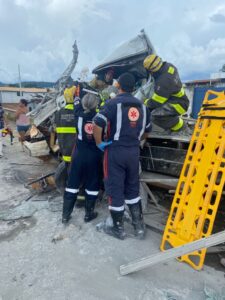 Um homem de 51 anos morreu e quatro pessoas ficaram feridas em um grave acidente nessa quarta-feira, 18/mar, envolvendo quatro veículos em Montes Claros. O acidente foi por volta das 15h, na Avenida Dr. Athair Lopes Rezende, no bairro Vila Telma, próximo ao Posto Opção II. A batida envolveu dois caminhões, sendo um deles carregado com cimento, além de um carro e uma caminhonete. De acordo com informações preliminares, o caminhão carregado seguia no sentido Bocaiúva → Montes Claros, quando o motorista perdeu o controle da direção e atingiu os demais veículos. Quando o regate chegou ao local do acidente encontrou o motorista da carreta preso as ferragens e já sem vida. O motorista do outro caminhão, de 64 anos, também ficou preso as ferragens. Ele foi retirado pelo Corpo de Bombeiros e entregue ao Samu com lesão na cabeça, suspeita de fratura na perna esquerda e quadro de choque hemorrágico. A vítima foi imobilizada, medicada e estabilizada, sendo encaminhada em estado grave para a Santa Casa. Outra vítima, um homem de 66 anos que estava em um dos caminhões, sofreu traumatismo craniano e também foi levada para a Santa Casa. Já um homem de 69 anos, ocupante do carro, apresentava dor torácica e foi encaminhado ao Hospital das Clínicas. Um quarto ferido, de 49 anos, relatava dores no tórax e foi socorrido pela concessionária responsável pela rodovia, sendo levado para o Hospital Pro Vida. As causas do acidente serão investigadas pela Polícia Civil.