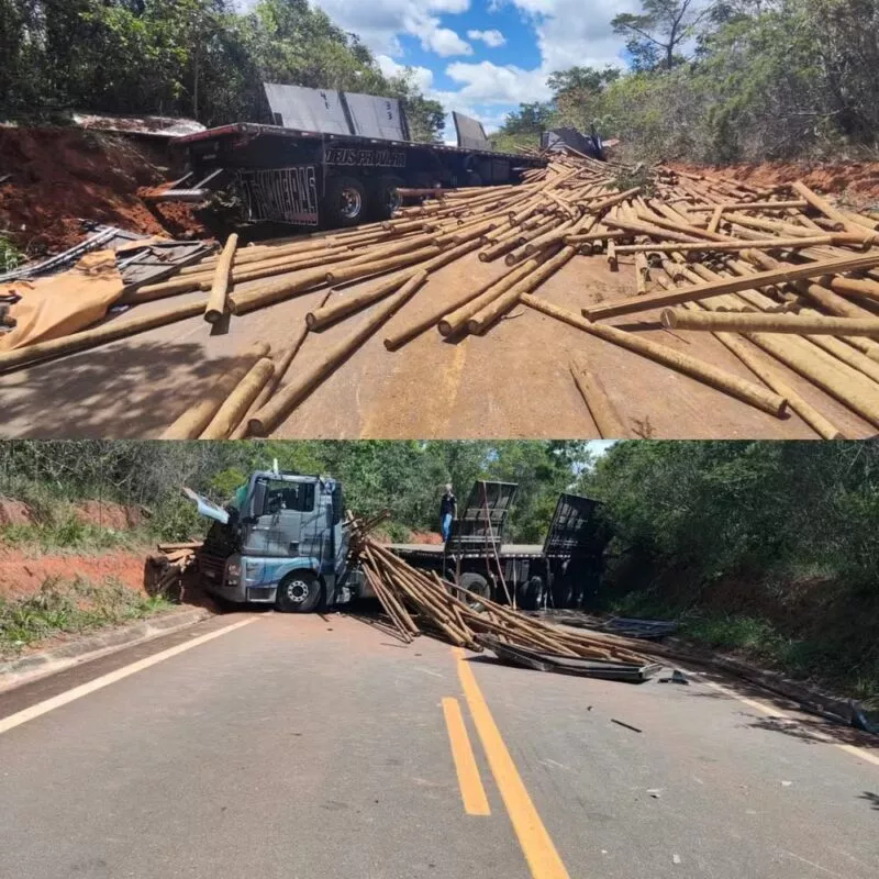 Mulher morre após caminhão carregado com eucalipto sair da pista e interditar rodovia em Turmalina